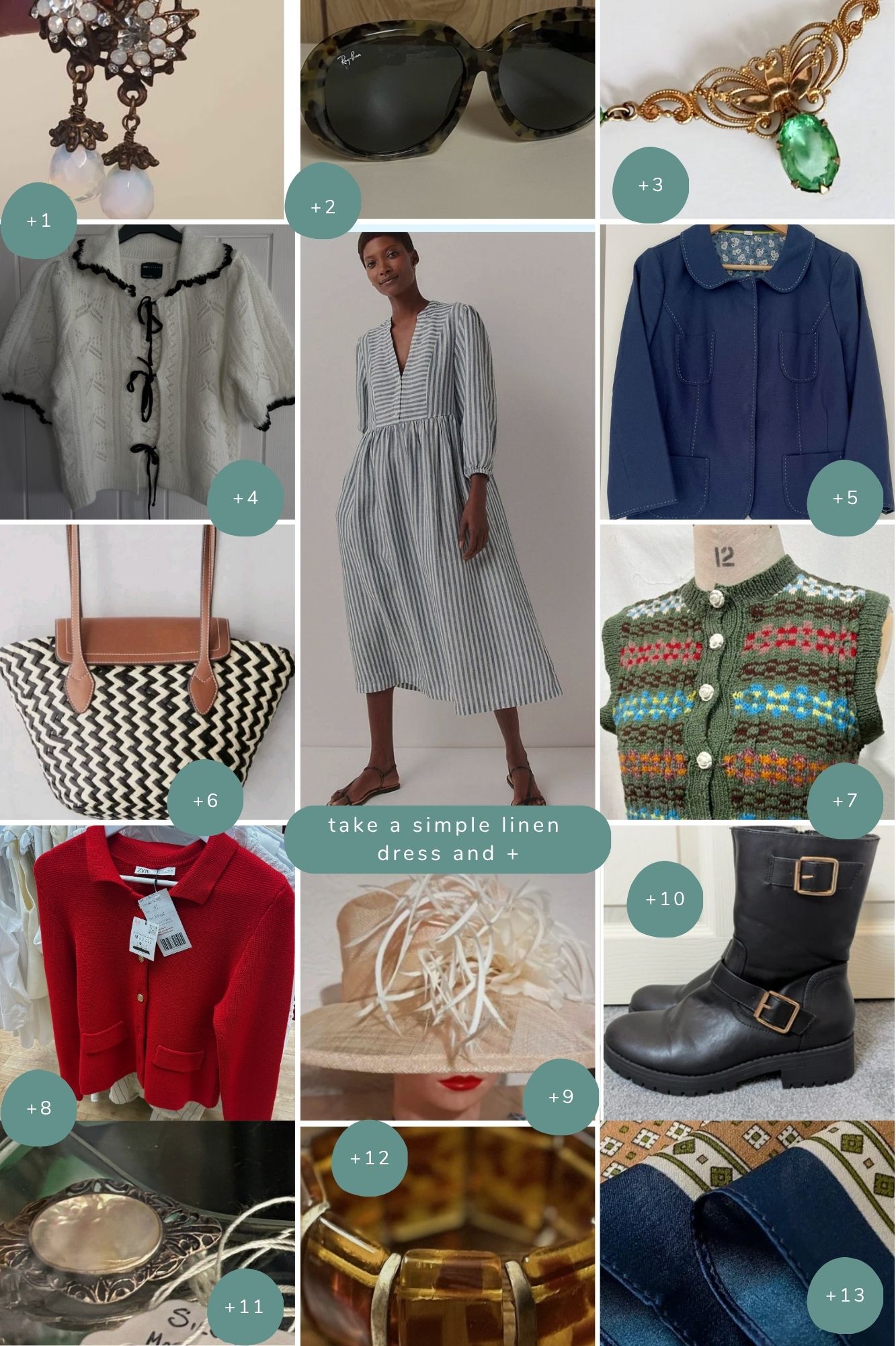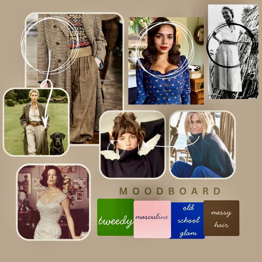 Sources for ‘mood board’ collage. 1. Scacto jumpsuit. 2. Pinterest. 3. Ava Gardner. 4. Greta Gardner (digital creator; Ivana Zotel). 5. Grace Kelly. 6. Mango. 7&8. Pinterest. 9. Joanie clothing. 10. Jennifer Aniston. 11. Denise Boomkens @and.bloom 12. Riot Women (BBC), 13. Sezane Conrad T-shirt. 14. Pinterest. 15. Chambers and Beau beads. 16. Zoe Babouche. 17. Ralph Lauren. 18. Pinterest. 19. Violeta Zuvela