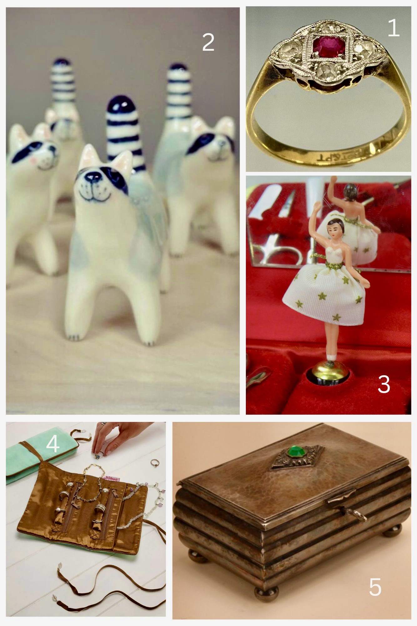 Here’s one more little challenge before I finish. Assemble your jewellery. Find your existing pieces; clean it, buy replacement butterflies for your earrings (you can buy a big box on Amazon for £4.99) and contact a local jeweller if your pieces need any repairs/alterations. Expand your collection by ask for jewellery as a gift, or treat yourself – if you buy well, those pieces should last a lifetime. Don’t forget to invest in something lovely to store in it;- a velvet pouch/roll, a classic box or a cute handmade racoon for your rings (above).