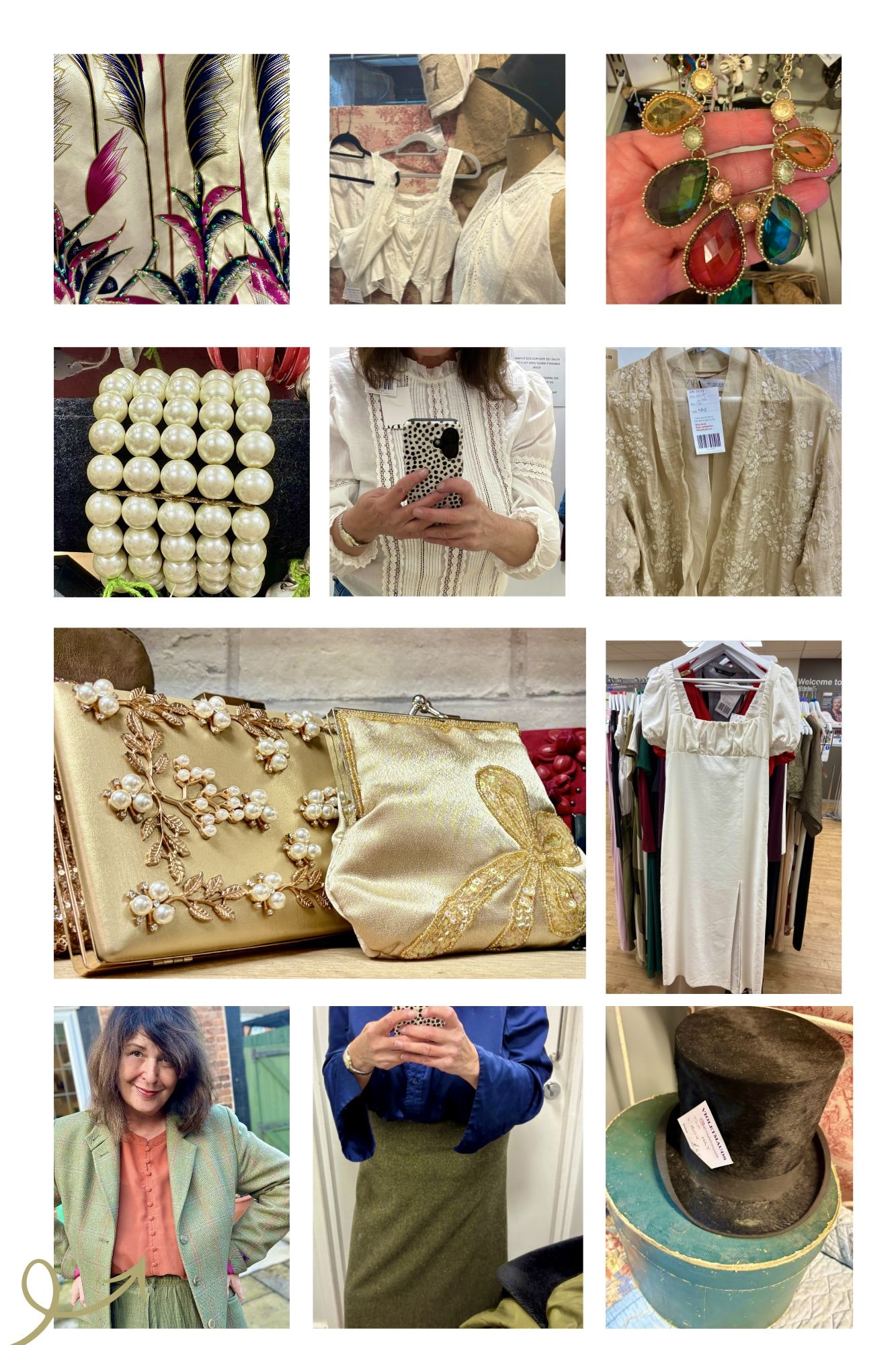 Sources for ‘mood board’ collage. 1. Scacto jumpsuit. 2. Pinterest. 3. Ava Gardner. 4. Greta Gardner (digital creator; Ivana Zotel). 5. Grace Kelly. 6. Mango. 7&8. Pinterest. 9. Joanie clothing. 10. Jennifer Aniston. 11. Denise Boomkens @and.bloom 12. Riot Women (BBC), 13. Sezane Conrad T-shirt. 14. Pinterest. 15. Chambers and Beau beads. 16. Zoe Babouche. 17. Ralph Lauren. 18. Pinterest. 19. Violeta Zuvela